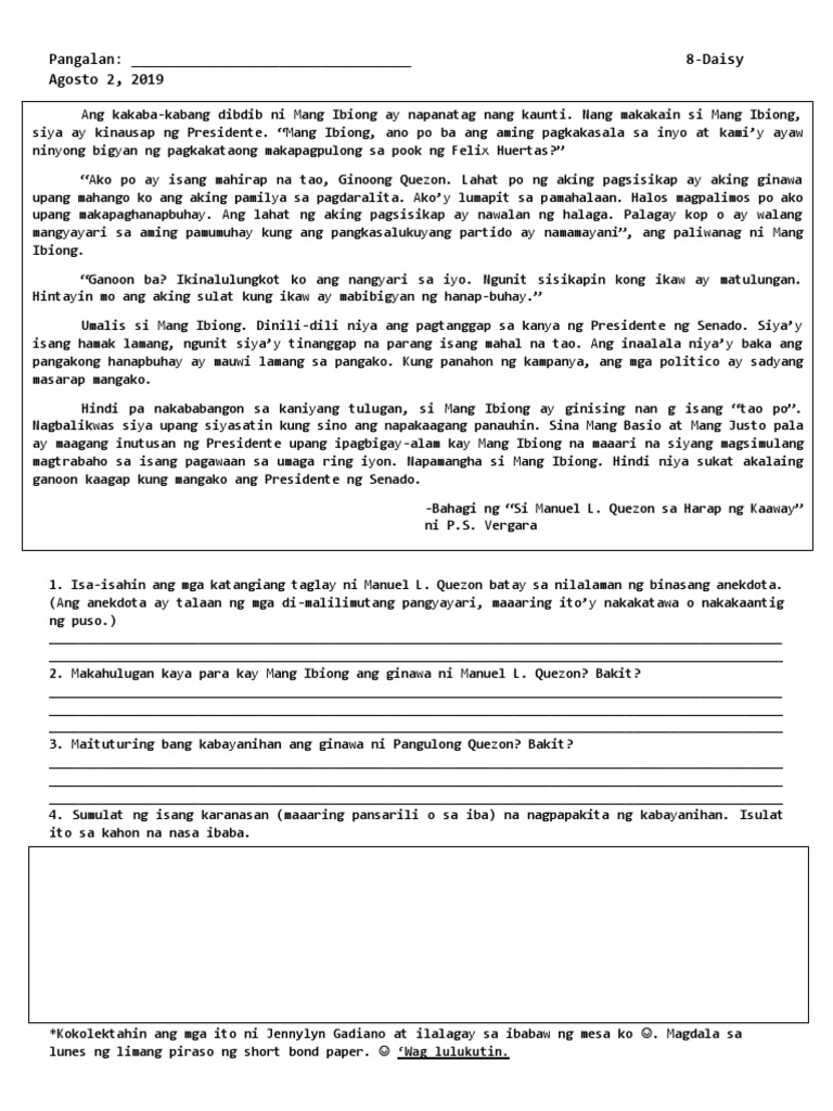 Isang halimbawa nito ay. 19082019 Si Pangulong Manuel LQuezon ay nag-iwan ng isang pamana sa kanyang mga kababayan na hindi na malilimutan. Ang tunay niyang pangalan ay Manuel Luis M.