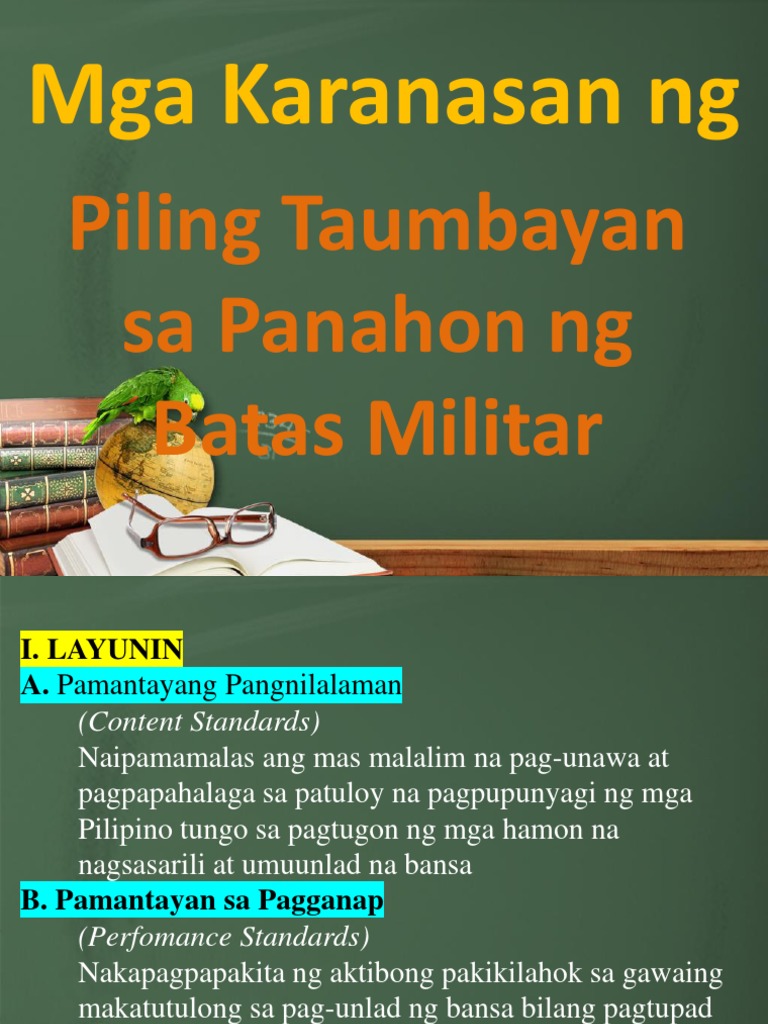 23012019 Karanasan ng mga piling taumbayan sa panahon ng mga batas militar Sa panahon ng batas militar maraming tao ang nahirapan. References Batayang Aklat sa AP 6 LM TG CG BOW 1. Tamang sagot sa tanong.
