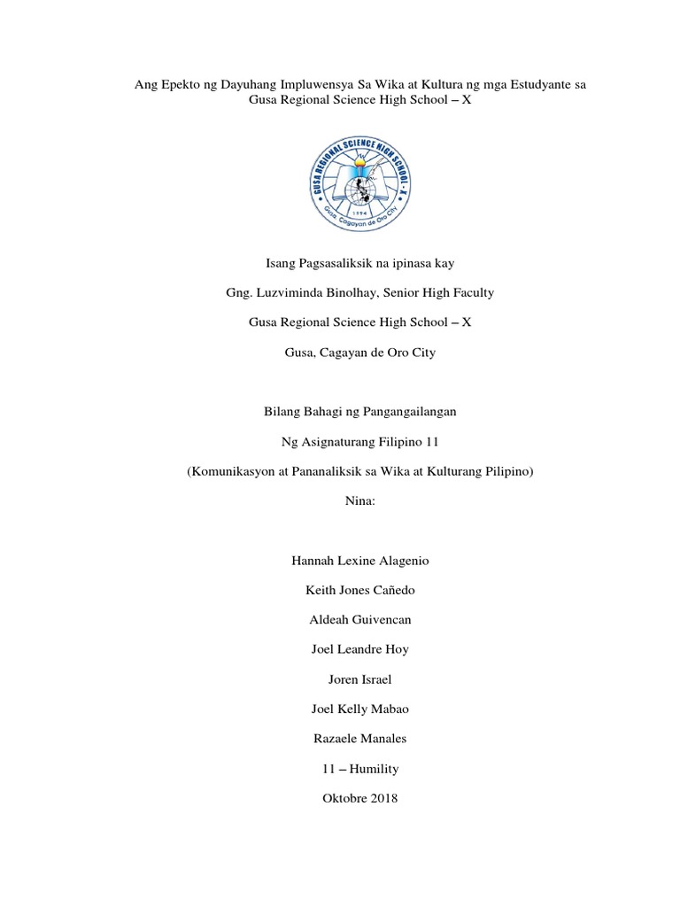 Ang Epekto Ng Dayuhang Impluwensya Sa Wika At Kultura Ng Mga Estudyante Sa Gusa Regional Science High School